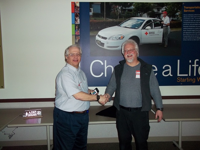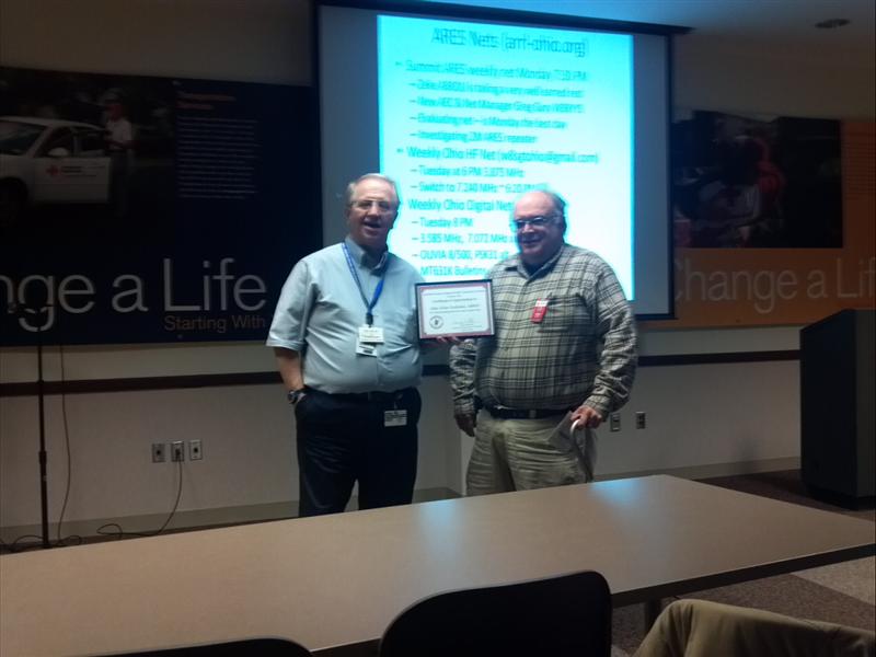 Plaque presentation: (L to R) Dennis Conklin (AI8P) Summit County EC, Allan Zadiraka (AB8OU) Summit County AEC